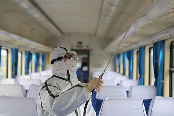 宿营车、卧铺、硬座车,一节车厢一节车厢的走,窗户、行李架、桌子、地面、乘务室、厕所……每个角落都认真喷洒药液,确保无死角消毒。