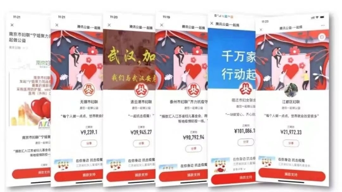 1月27日,南京市妇联开通网上募捐通道,开展“宁姐聚力同战疫”募捐活动,积极组织发动全市女企业家、社会组织和个人开展募捐,截至发稿时,已筹集近70万元用于武汉、南京等地疫情防控一线,另募集到30万人份新型冠状病毒检测试剂盒、8000件防护服、N95医用口罩4万个。