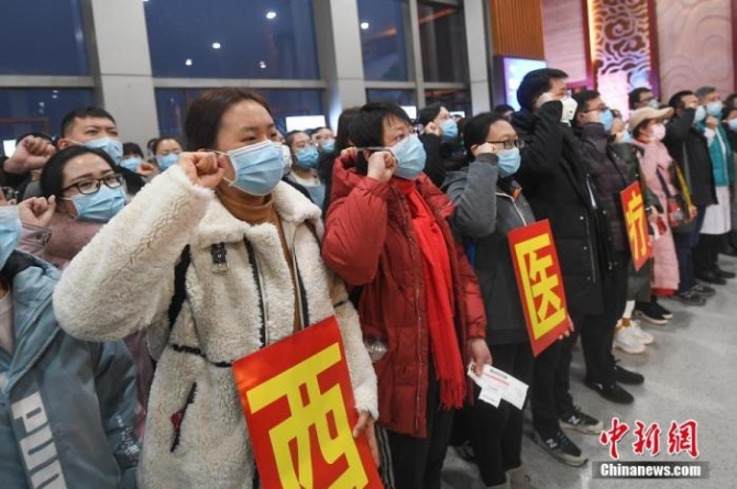 1月26日,山西太原武宿机场,由山西省34所医院重症医学科、呼吸科、感染科的医生、护士等共137人组建的医疗队,奔赴湖北开展新型冠状病毒感染的肺炎医疗救治工作。中新社记者 武俊杰 摄