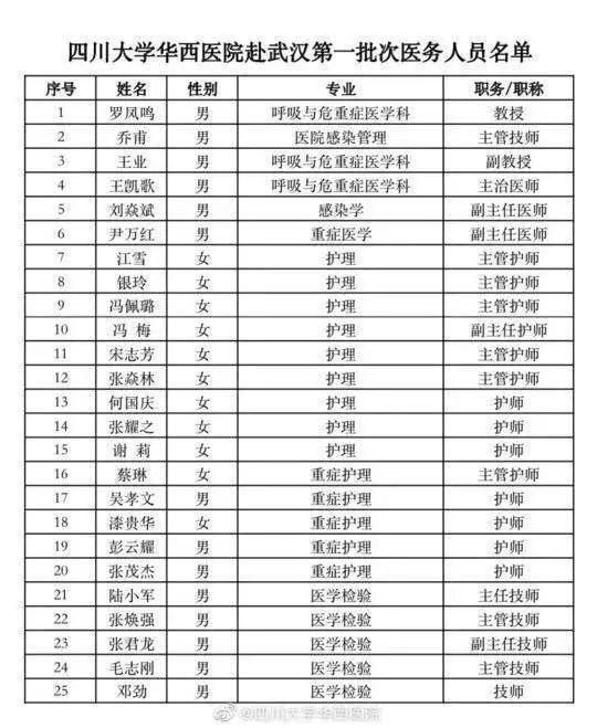 目前,来自四川大学华西医院感染管理部、呼吸与危重症医学科、重症医学科、感染性疾病中心等部门的第一批25名医护人员已飞赴武汉。这25名队员分别来自呼吸与危重症医学科、重症医学科、感染性疾病中心、实验医学科等专业的医务人员,其中5名医师、14名护师、5名技师,均是自愿报名参加医疗队。其中,华西医院感控专家乔甫今日清晨先行出发赶赴武汉疫情前线开展工作。此外,华西医院第二批次队员也在集结中。