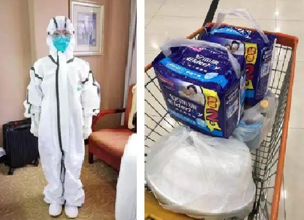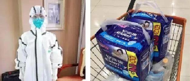 左图:穿防护服的董婷婷,右图:两大包必备“神器”——成人纸尿裤。