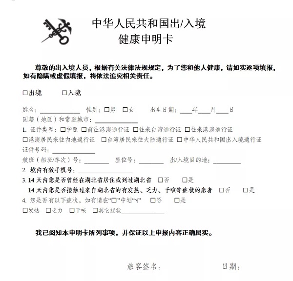 《关于重新启动出入境人员填写健康申明卡制度的公告》