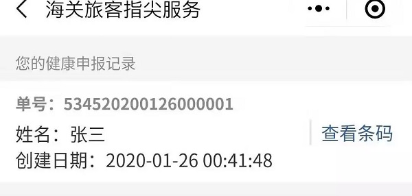 相关申报记录即可自动保存在“查看健康申报记录”内并生成条形码,如下图: