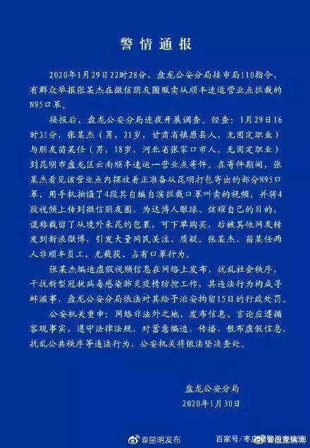 接报后,盘龙公安分局连夜开展调查。经查,1月29日16时31分,张某杰(男,21岁,甘肃省镇原县人,无固定职业)与朋友苗某任(男,18岁,河北省张家口市人,无固定职业)到昆明市盘龙区云南顺丰速运一营业点寄件。在寄件期间,张某杰看见该营业点内摆放着正准备从昆明打包寄出的部分 N95口罩,用手机拍摄了4 段其自编自演拦截口罩叫卖的视频,并将段视频上传到微信朋友圈,为达博人眼球、炫耀自己的目的谎称截留了从境外来昆的包裹,可下单购买,后被其他网友转发到新浪徽博,引发大量网民关注、质疑。张某杰、苗某任两人非顺丰员工,无截获、占有口罩行为。