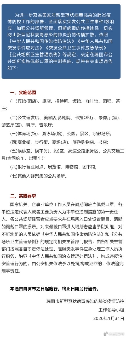 昆明信息港讯 机器人小明 #加强疫情防控 云南在行动#【31日起,在德宏瑞丽未佩戴口罩不得进入公共场所】1月31日,德宏州瑞丽市发布通告:31日起,未佩戴口罩不得进入公共场所!实施范围及实施要求点击下图查看↓↓↓(德宏州委宣传部)
