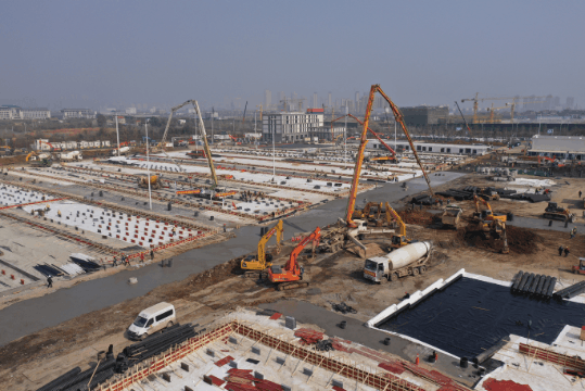 截至1月30日中午12时,武汉火神山医院项目场地平整、砂石回填、HDPE膜铺设全部完成,基础混凝土浇筑完成95%;集装箱板房进场、改装、吊装正快速推进。管线沟槽开挖、埋设及回填完成50%;污水处理间设备吊装完成,管道安装完成60%;调蓄水池HDPE膜开始铺设。