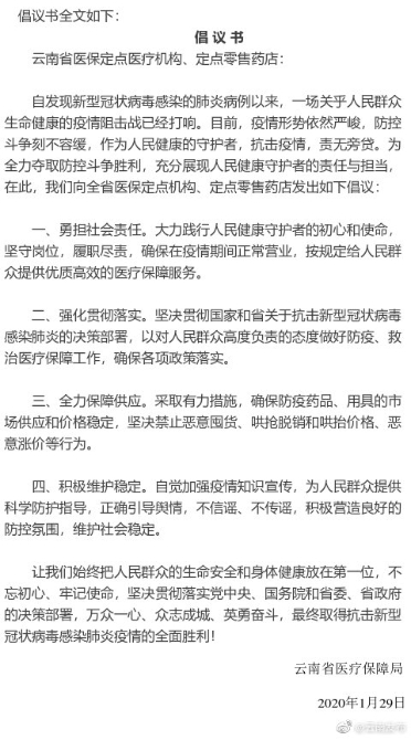 昆明信息港讯 机器人小明 #加强疫情防控 云南在行动#【全力保障供应 云南省医保局向全省定点医药机构发出4条倡议】为全力支持云南省疫情防控工作,进一步形成打好疫情防控阻击战的工作合力,1月29日,省医疗保障局向全省医保定点医疗机构、定点零售药店发出4条倡议: