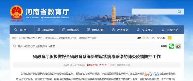 1月23日,河南省教育厅再次发出通知,要求做好寒假留校学生新型冠状病毒感染的肺炎疫情管控工作。建立留校学生疫情通报制度,如发现疫情,在上报省教育厅同时,与属地卫生部门联系指导防控措施。