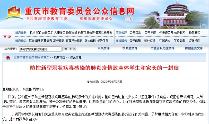 1月27日,重庆市教委发布《致全体学生和家长的一封信——让我们共同做好新型冠状病毒感染的肺炎疫情防控工作》,告知同学和家长朋友们关注重庆教育政务微信上推送的新型冠状病毒感染的肺炎防控有关内容,了解疫情相关信息,学习健康防病知识,提高自我防护能力。
