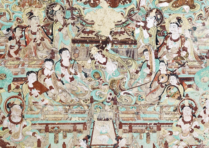 飞天是敦煌艺术的标志之一。据统计,仅莫高窟就绘有飞天约4500身之多,加上其余石窟,共计近6000身。图为榆林窟第15窟前室顶南侧的飞天。 敦煌研究院供图