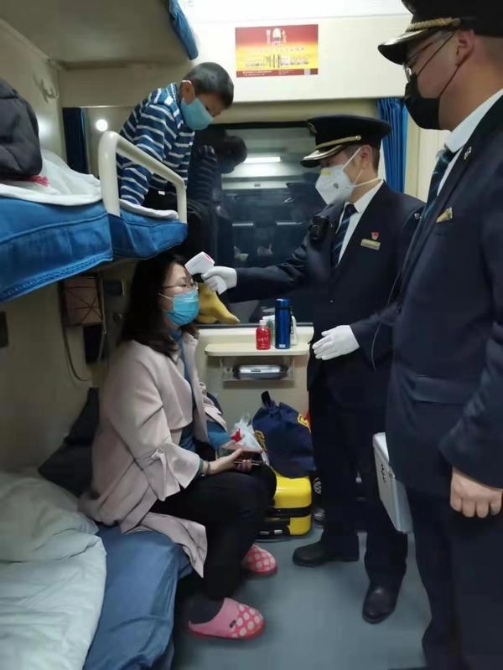 乘务途中,他们戴着口罩、手套,在车厢逐一为旅客测量体温,并随身携带列车专用药箱,为不适的旅客提供急救药品,尽力为旅客提供周到的服务和帮助。