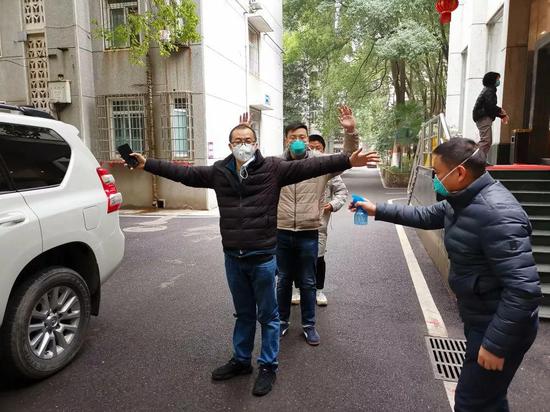 2020年1月23日,新华社记者采访结束后,用酒精进行人车消毒。
