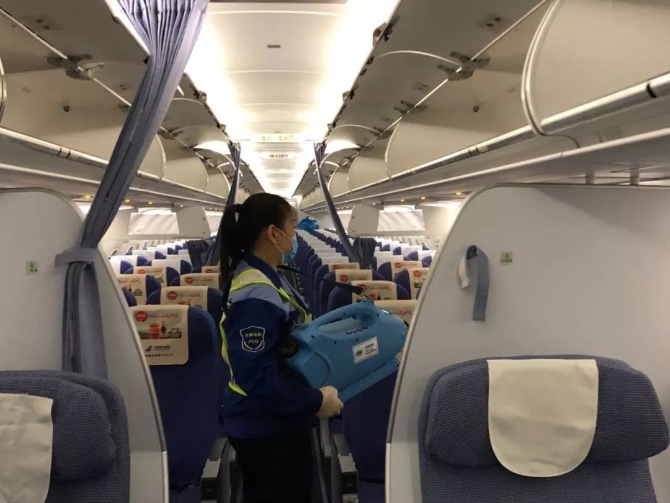 航后清洁:使用消毒剂擦拭客舱门周边、小桌板、扶手及洗手间等乘客接触较多的区域。每天航班运行结束后对飞机做预防性消毒。