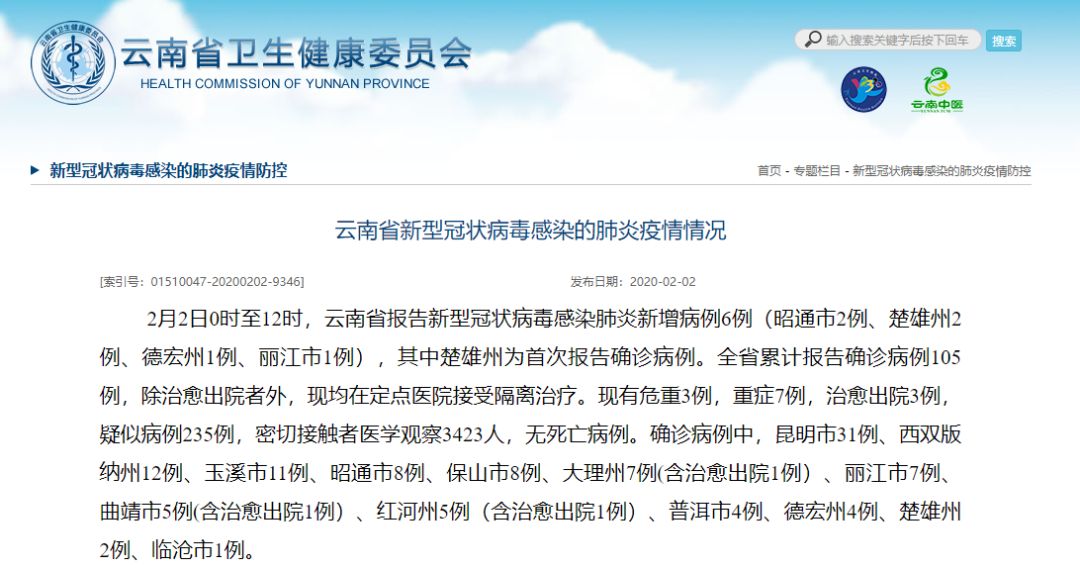 据云南省卫健委的通报,2月2日0时至12时,云南省报告新型冠状病毒感染肺炎新增病例6例(昭通市2例、楚雄州2例、德宏州1例、丽江市1例),其中楚雄州为首次报告确诊病例。全省累计报告确诊病例105例,除治愈出院者外,现均在定点医院接受隔离治疗。现有危重3例,重症7例,治愈出院3例,疑似病例235例,密切接触者医学观察3423人,无死亡病例。确诊病例中,昆明市31例、西双版纳州12例、玉溪市11例、昭通市8例、保山市8例、大理州7例(含治愈出院1例)、丽江市7例、曲靖市5例(含治愈出院1例)、红河州5例(含治愈出院1例)、普洱市4例、德宏州4例、楚雄州2例、临沧市1例。