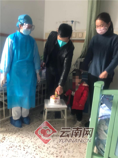 1月31日,一个简单但特别有意义的生日会在昆明市儿童医院书林院区的隔离病房举行。在祝福声中,来自武汉的小征(化名)和父母一起吹灭了2岁生日蛋糕上的蜡烛!