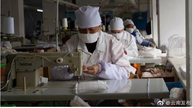 从1月27日开始,个旧云锡劳动防护用品有限责任公司口罩车间正式恢复生产,工人们全副武装,正在紧张有序地忙碌着。