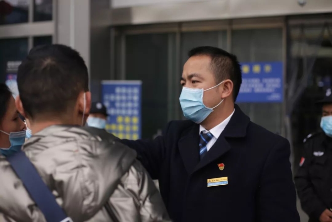 1月31日,G1376次开往贵阳北站的列车上发现有武汉旅行史的疑似发热乘客。得知情况后,文涛让年轻同事做好防护消毒和旅客信息登记,自己穿戴上防护服随同医疗防疫人员进入车厢引导该名旅客到车站的留置观察区进一步复查。脱下厚重的防护服后,文涛的制服早已被汗水浸湿。他来不及换衣服就又重新折回岗位,配合防疫人员对车厢内其他旅客进行健康信息登记,做好站台消毒。