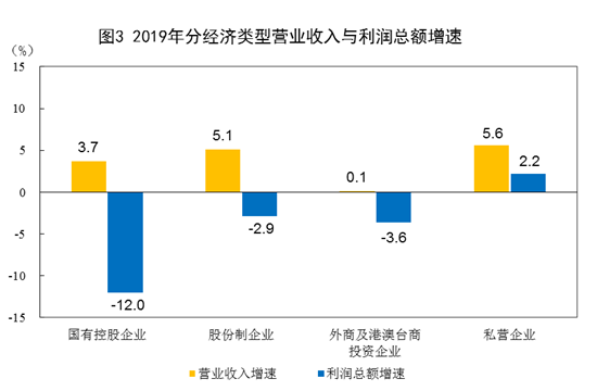 2019年,规模以上工业企业中,国有控股企业实现利润总额16355.5亿元,比上年下降12.0%;股份制企业实现利润总额45283.9亿元,下降2.9%;外商及港澳台商投资企业实现利润总额15580.0亿元,下降3.6%;私营企业实现利润总额18181.9亿元,增长2.2%。