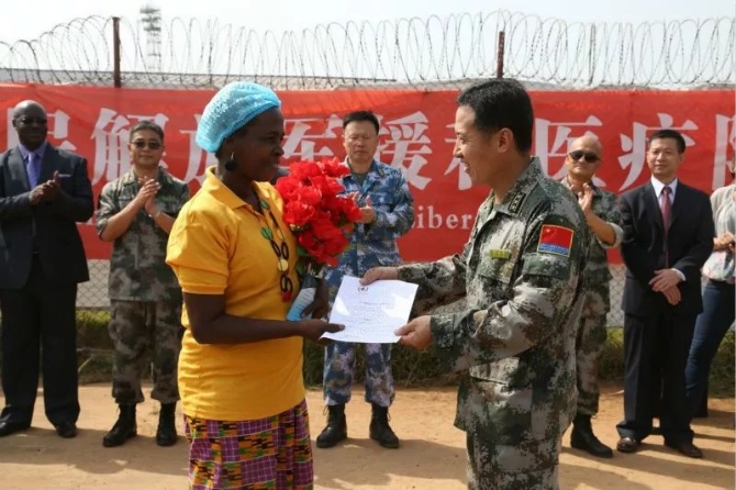 2015年3月5日,在利比里亚首都蒙罗维亚,中国援利医疗队队长杨海伟(右)向埃博拉患者亚杜罗颁发出院证书。她是中国埃博拉治疗中心最后一名治愈的埃博拉患者。新华社发(李斌 摄)