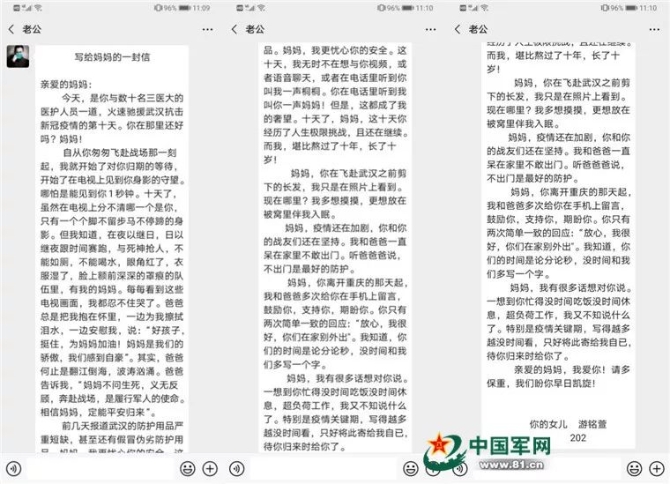 2月2日,一封“写给妈妈的信”让军队支援湖北医疗队队员刘晓青感动不已。字里行间,流露着女儿对她的想念、关心、敬佩和支持。