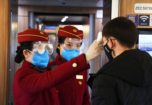 1月31日,京津城际列车乘务员在对乘客进行体温检测(北京铁路供图 杨宝森 摄)