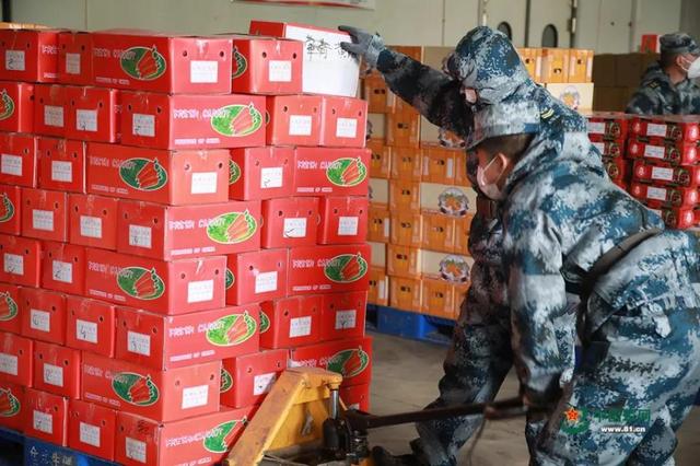 官兵正在装载要运送到武汉市各大超市的物资。洪培舒/摄