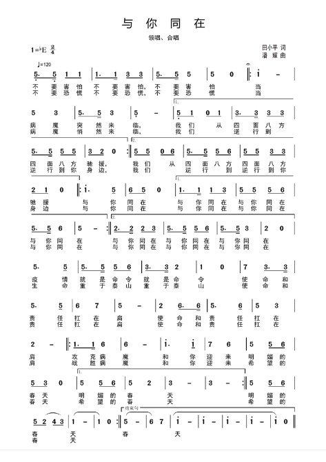 在作词完成后,田小平又联系到了北京一家音乐工作室进行加急制作。为《与你同在》谱曲的是毕业于四川音乐学院的原二炮文工团作曲家潘耀,领唱是毕业于中国音乐学院声乐系、现就职于文化和旅游部高校,在这家工作室担任音乐总监的李煜惜。“歌词定稿后,我连夜联系北京暖调工作室负责人李煜惜,她爽快答应加急制作,并亲自领唱这首歌。她说‘一定要加急,因为现在疫情最紧张’。”