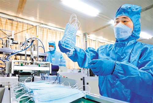 江西省宜丰县黄岗山垦殖场宝泽医疗用品有限公司防护口罩生产车间,员工赶制防护口罩,确保湖北市场供应。何贱来摄