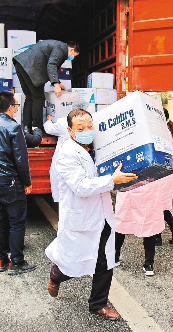 湖北省十堰市郧阳区疾控中心医护人员在搬运北京市东城区企业及社会爱心人士捐赠价值116.8万元的战“疫”物资。 曹忠宏摄