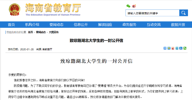 因疫情问题,为了不耽误同学们的学业,教育部高等教育司已协调了“爱课程”等各大平台,为你们提供延迟开学期间在线学习资源。海南省教育厅也将积极与湖北省教育厅联络沟通,做好延迟开学的预案,采取各种有效措施,包括利用线上教学的形式,为你们提供网上学习资源。上网学习过程中如遇到网络不畅或流量不足问题,请通过QQ群联系,我们将协调通信部门解决并做好相关服务。