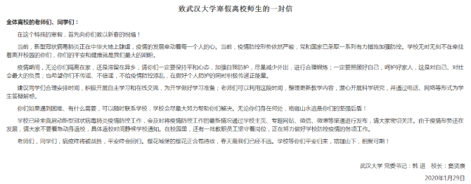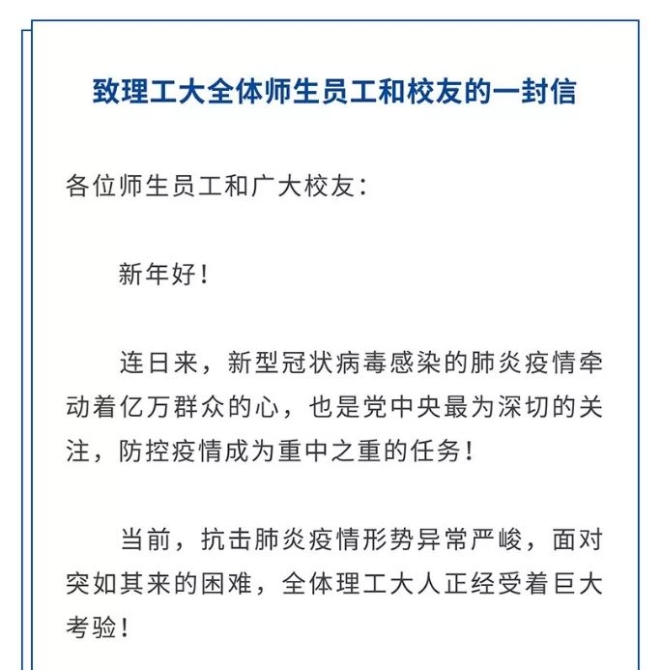 全体师生员工、校友们,让我们凝聚起团结一心、众志成城、共克时艰的强大理工力量,为尽早打赢疫情防控这一攻坚战而共同拼搏。我们坚信有党的坚强领导和全体理工大人的必胜信念,再困难的疫情必将如汤沃雪。
