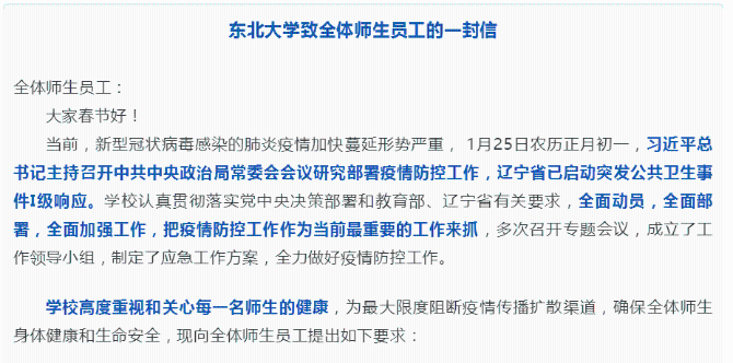 广大师生对推迟开学、每日报告个人信息和加强校园管理的相关要求,给予了充分理解和大力支持,为疫情防控精准施策奠定了坚实基础。在大家的积极配合下,我们疫情防控的工作成效不断提升。我们要对全体师生道一声感谢,你们的信任就是对我们战胜疫情最大的鼓励!