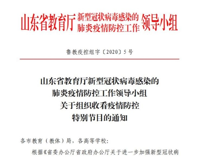 近日,山东省教育厅下发《关于组织观看疫情防控特别节目的通知》。山东省教育厅委托山东教育电视台策划制作了《新课堂——同心战“疫”特别节目》,节目自2月3日起至春季开学,每晚19:35,如《新闻联播》延时,节目播出时间顺延。本次活动采取电视录播和网络视频直播两种方式进行,学生、教师和家长可通过电视端和网络端收看学习。