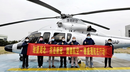 2月5日上午,捷德航空全资子公司德盛通航一架满载医用物资的空客H155直升机由浙江起飞,将防控一线紧缺的医用物资定向投送至湖北黄冈、武汉和孝感三地。