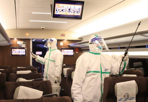 2月4日,中国铁路北京局集团有限公司对返回北京动车段的复兴号进行车内消毒作业。张晴/摄