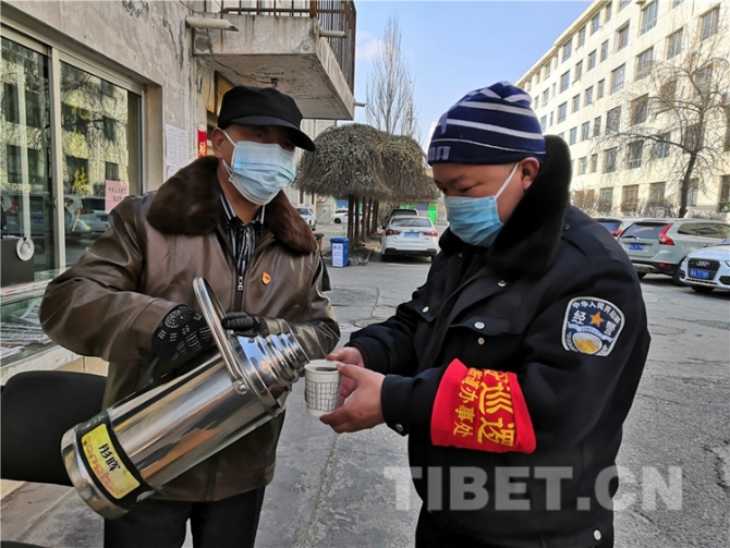 这个时节的青海还是非常寒冷的,社区一位70岁老党员山礼仁给巡逻的工作人员送来一壶冒着热气的姜汤,让大家从身上暖到了心里。
