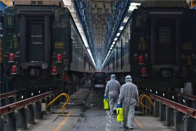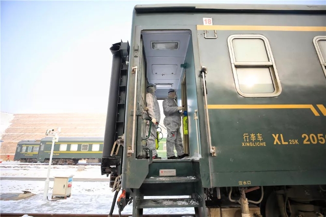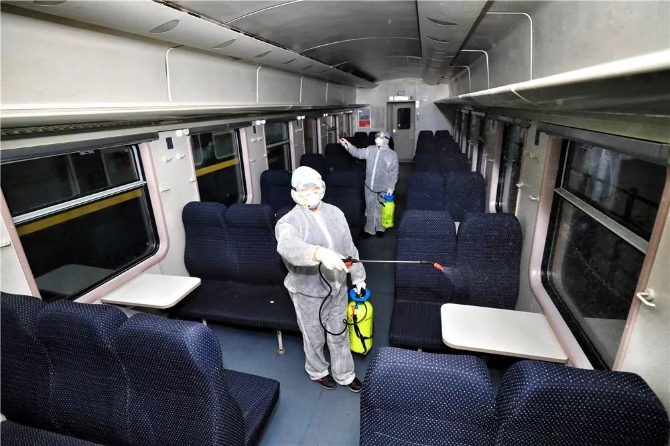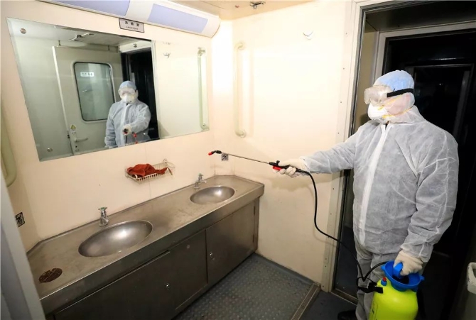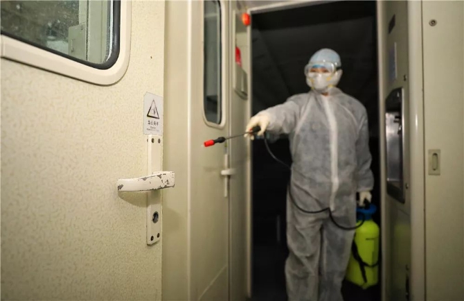 抗击疫情以来,中国铁路乌鲁木齐局集团有限公司疾控中心消杀科站车消杀队始终战斗在第一线。他们对每天入库的客车车体进行全面的消毒,工作量之大以至于他们每天中午吃饭的时间只有20分钟。