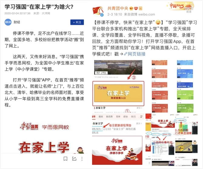 看点2.“在家上学”专区:停课不停学!“学习强国”联合“学而思”“新东方”“猿辅导”“作业帮”“掌门教育”等多家教育机构,组织上百位北大、清华、哈佛毕业名师,全国特级教师、家庭教育专家、心理学专家为延期开学的中小学生讲课,提供从小学一年级到高中三年级全学科、全时段课程,直播、回看两不误,实现“停课不停教”“停课不停学”。此外,还有北京101中学、人大附中、清华附中、成都七中、中关村小学等中小学名校上千堂部级优质课程,让全国各地的孩子们足不出户就能享受最优质的教育资源。