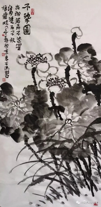 在全国人民抗击病毒之时,我创作出淤泥而不染的荷花《不染图》声援抗击病毒的战役。祝大家身体健康。全国人民团结一致,一定能够战胜病毒。向战斗在一线的医护人员致敬,武汉坚强。中国必胜!——李晓军