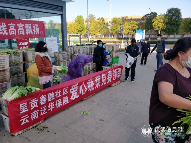 昆明信息港讯 记者段佳琪 为缓解防控疫情给居民生活带来的影响,2月6日,呈贡区乌龙街道春融社区为惠兰园和惠景园小区近1500多户居民,免费赠送瓢菜、油麦菜、黄白等共5吨新鲜蔬菜,在倡导居民疫情防控期间少出一趟门、多一份保障的基础上,确保辖区居民正常的生活。