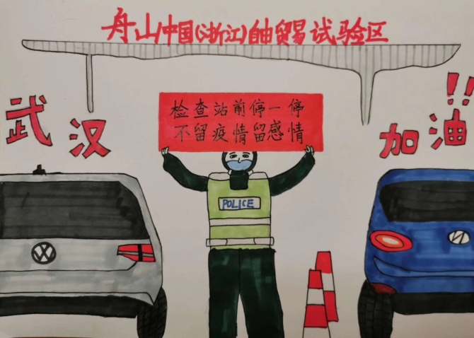 如何缓解车主的焦躁情绪?舟山市公安局定海区分局想出了一个办法:他们用硬纸板做了一个宣传牌,贴上红纸写上了一句委婉又暖心的话,“检查站前停一停,不留疫情留感情”。希望能通过这样的方式缓解车主的焦虑心情。但现场警力紧张,谁来举呢?