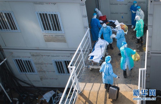 2月4日,医护人员将患者送入病房(无人机照片)。 当日,武汉火神山新型冠状病毒感染肺炎专科医院开始正式接诊新型冠状病毒感染的肺炎确诊患者。新华社记者 肖艺九 摄