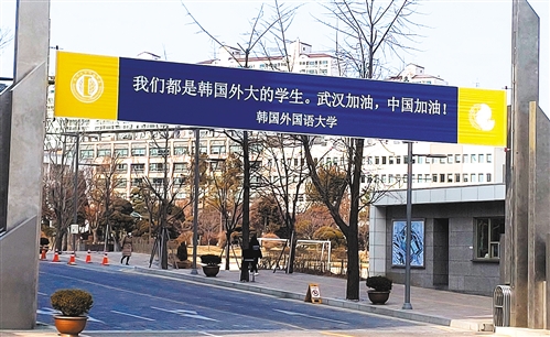 韩国外国语大学学生在校园内通过挂横幅方式表达对武汉和中国的支持。 经济日报-中国经济网记者 白云飞摄