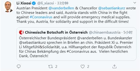中国驻奥地利共和国大使李晓驷在社交媒体上发文感谢奥地利对中国的支持。