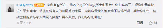 iCxFlyaway:向所有奋战在一线各个岗位的抗疫战士们致敬!您们辛苦了!祝您们元宵快乐!平安健康!相信在所有人的共同努力中国一定能以最快的速度拿下这场战役!期待您们每一位战士凯旋后与家人团聚的笑脸!再次致敬,我们与您们同在!