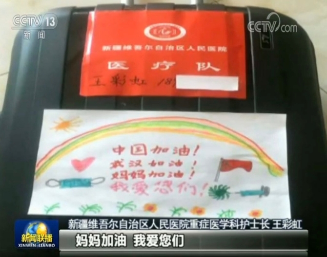 这两天,又一批医护人员在各地集结出征,大家的方向只有一个——那就是湖北武汉。王彩虹是新疆第三批支援湖北医疗队的一名护士,在她的行李箱上贴着一幅儿子的画。