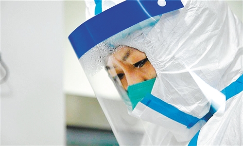 武汉协和医院感染科护士喻银燕正在工作。 (武汉协和医院供图)