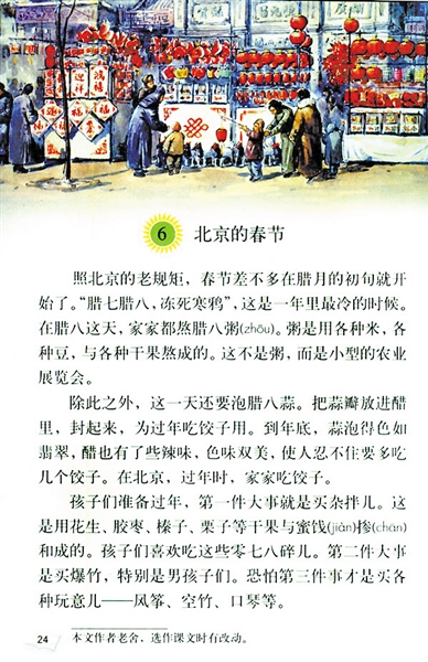 “中国阴历新年,是中国人一年中最大的佳节,其他节日,似乎均少节期的意味。”(林语堂《庆祝旧历元旦》,部编版八年级语文下册)“村风乡俗中,四时二十四节色彩缤纷,而最有鲜明地方特色和浓郁乡土风味的,却是二十四节之外的春节。”(刘绍棠《本命年的回想》,苏教版七年级语文上册)
