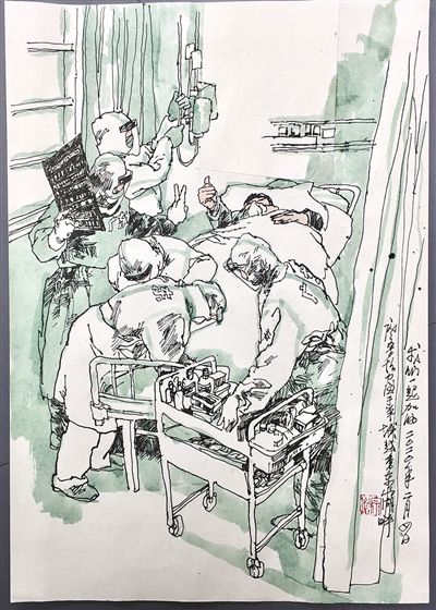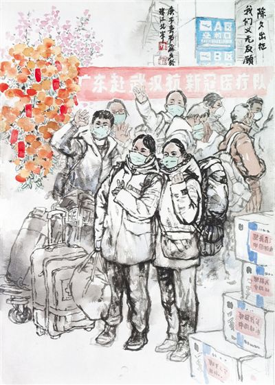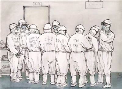 编者按:冬春之季,疫情告急,全国人民迅速行动起来,打响了一场没有硝烟的战争。除夕前后,各地医疗队迅速驰援武汉等疫情严重地区。医护人员奔赴战“疫”前线,他们筑起了健康防线,也在人们心里筑起一道信念的防线。这些天,被口罩勒到破皮的脸颊,被汗水浸到泛白的双手,手术室外席地而眠的身影……医护人员与时间赛跑、跟病毒搏击,让人民群众真切体会到什么是白衣战士的无畏、坚韧、奉献。广东医疗队是最早抵达武汉的驰援队伍之一,他们专业、敬业的救治,得到了患者和家属的信任和好评。广东医疗队也是所有奋战在抗疫一线的白衣战士的缩影,他们是丈夫,是妻子,是父母;是医生,是请战者,更是勇士。他们是最美“逆行者”,他们心中有更多需要守护的人。以医疗队发回的大量日记为素材,我们联同中国美术家协会,组织画家们记录下不同寻常的一幕幕,那些瞬间注定会成为永恒的经典。(文字采写:吴春燕 张玉梅 于园媛)