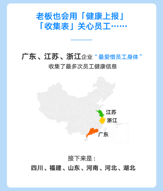肺炎疫情牵动着每个人的心,为了响应国家号召,保障为一个人的安全,健康上报成为防疫的重要部署。报告显示,疫情期间广东、江苏、浙江企业在繁忙的工作外,时刻关注每位员工的身体健康,收集员工健康信息次数最多,四川、福建、山东等紧随其后。